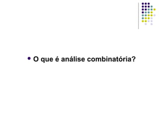 O documento discute os conceitos fundamentais da análise combinatória, incluindo permutações, arranjos, combinações e seus usos para resolver problemas de contagem. É apresentada a definição formal de cada conceito juntamente com exemplos numéricos de sua aplicação.