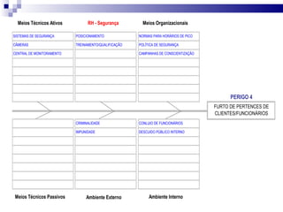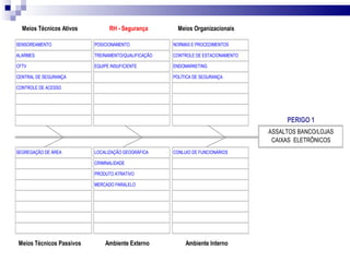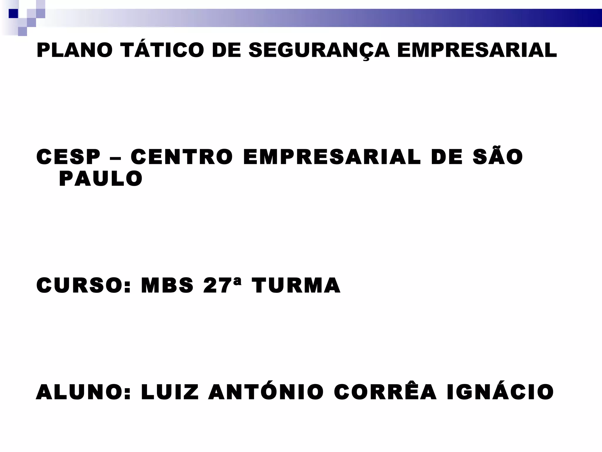 O documento apresenta um plano tático de segurança para o Centro Empresarial de São Paulo, com 12 fases: identificação de perigos, fatores de risco, diagnóstico SWOT, matriz de impacto cruzado, probabilidade, impacto no negócio, vulnerabilidade, soluções, plano de ação, controle PDCA, justificativa e conclusão. O objetivo é identificar e tratar riscos que prejudiquem o crescimento sustentável da organização de forma econômica.