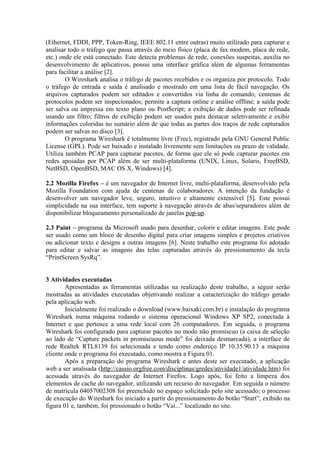 Este documento descreve o uso da ferramenta Wireshark para analisar o tráfego de rede gerado por uma aplicação web. Ele explica como configurar o Wireshark, acessar o site, capturar o tráfego e analisar os protocolos, objetos e ações envolvidas na comunicação entre o cliente e o servidor.