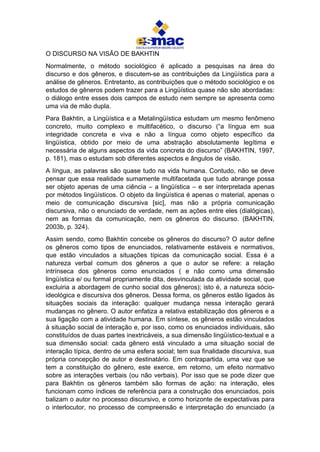 O documento discute a visão de Bakhtin sobre análise do discurso. Para Bakhtin, o discurso só pode ser estudado no contexto da interação humana, e não isoladamente. Ele define os gêneros discursivos como tipos de enunciados ligados a situações sociais típicas. O enunciado é a unidade concreta da comunicação, que reflete o contexto social e a individualidade do falante.