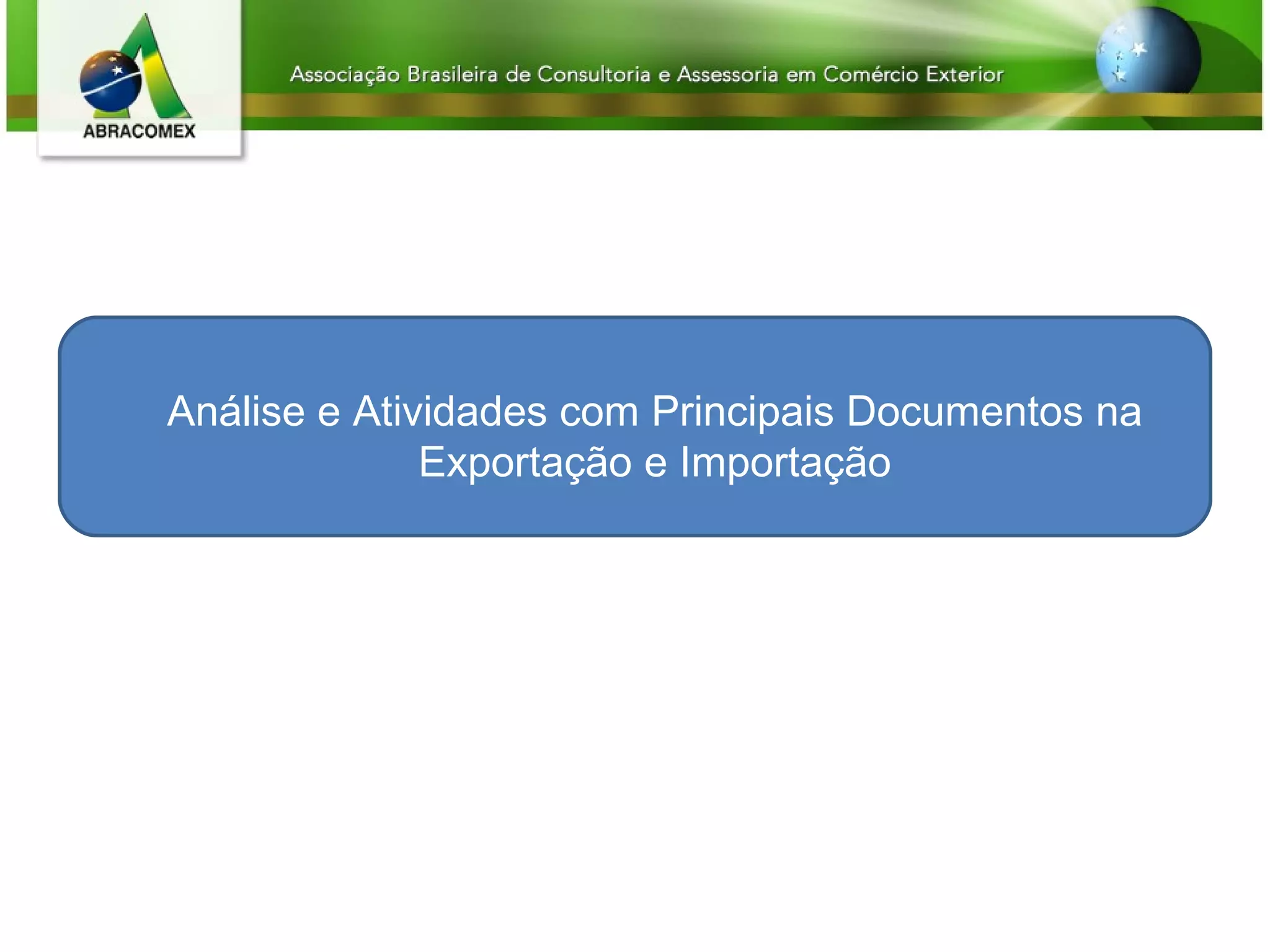 Este documento descreve os principais documentos necessários para exportação e importação de mercadorias no comércio internacional, incluindo documentos da mercadoria, da logística aduaneira e financeiros. Detalha cada um destes documentos como proforma invoice, commercial invoice, packing list, certificado de origem, conhecimento de transporte, apólice de seguro, nota fiscal, carta de crédito e contrato de câmbio.