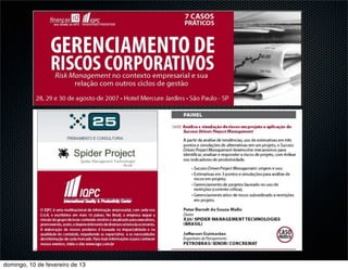 O documento aborda a metodologia de gerenciamento de projetos chamada Success Driven Project Management (SDPM), que enfatiza a gestão de riscos e a criação de cronogramas críticos com base em simulações e identificação de cenários. Introduzido na Rússia na década de 90, o SDPM permite reservas financeiras e de tempo para aumentar a probabilidade de sucesso dos projetos. A metodologia destaca a importância da análise de três cenários (otimista, provável e pessimista) e seu impacto na gestão de projetos em diversas indústrias.