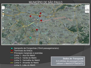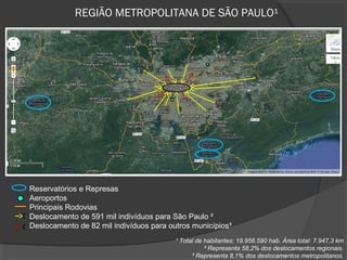 O documento fornece informações sobre a Região Metropolitana de São Paulo e o município de São Paulo, destacando dados sobre transporte e deslocamento. Em seguida, apresenta detalhes sobre a Zona Oeste da cidade, incluindo dados demográficos. Por fim, fornece detalhes sobre a área de intervenção na Vila Madalena, com mapas e informações sobre o projeto de extensão do metrô para a região.