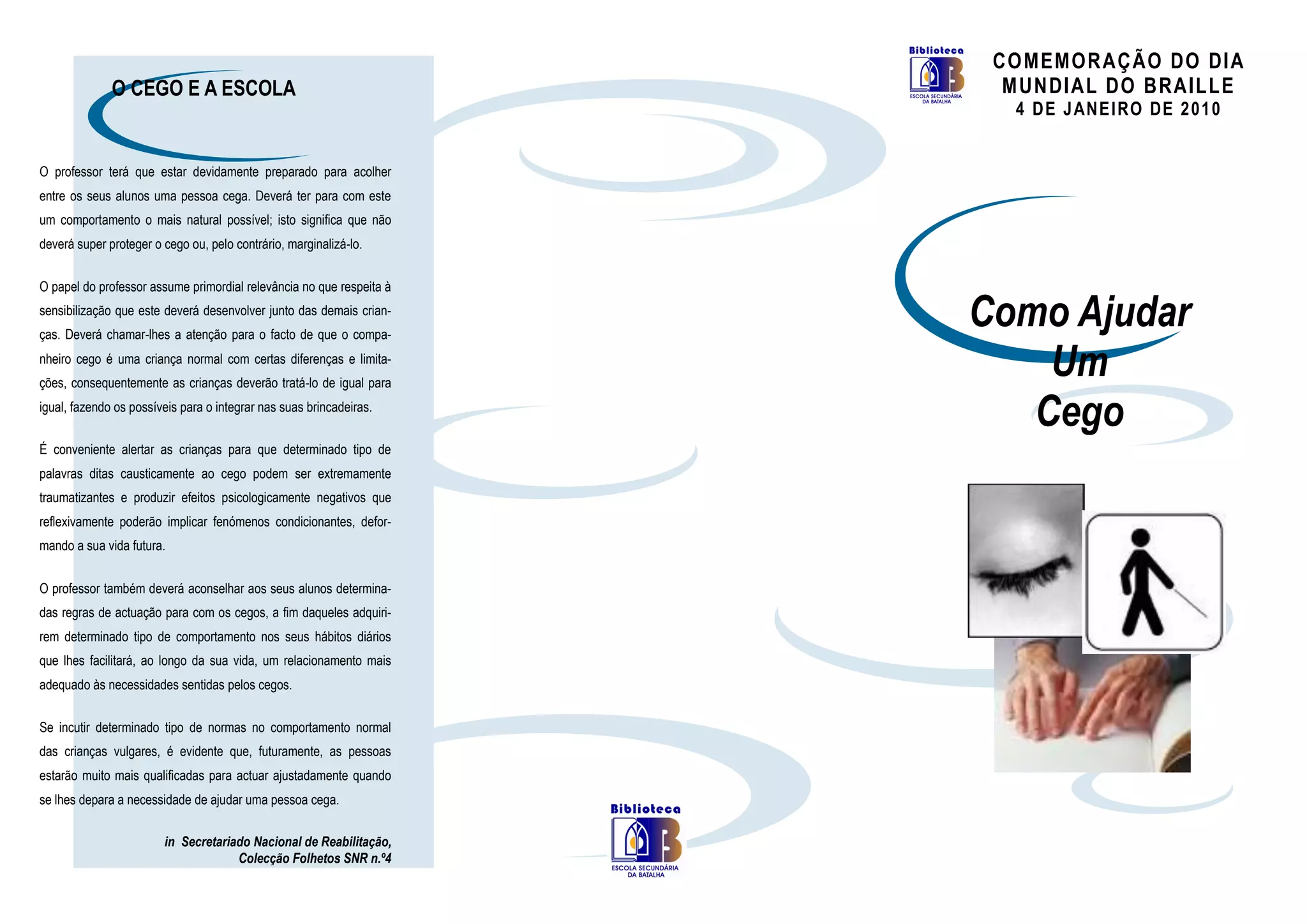 CO MEMORAÇÃO DODIA O CEGO E A ESCOLA M UNDIAL DO BRAILLE 4 DE J ANE I RO DE 2 01 0 O professor terá que estar devidamente preparado para acolher entre os seus alunos uma pessoa cega. Deverá ter para com este um comportamento o mais natural possível; isto significa que não deverá super proteger o cego ou, pelo contrário, marginalizá-lo. O papel do professor assume primordial relevância no que respeita à sensibilização que este deverá desenvolver junto das demais crian- ças. Deverá chamar-lhes a atenção para o facto de que o compa- Como Ajudar nheiro cego é uma criança normal com certas diferenças e limita- ções, consequentemente as crianças deverão tratá-lo de igual para Um igual, fazendo os possíveis para o integrar nas suas brincadeiras. Cego É conveniente alertar as crianças para que determinado tipo de palavras ditas causticamente ao cego podem ser extremamente traumatizantes e produzir efeitos psicologicamente negativos que reflexivamente poderão implicar fenómenos condicionantes, defor- mando a sua vida futura. O professor também deverá aconselhar aos seus alunos determina- das regras de actuação para com os cegos, a fim daqueles adquiri- rem determinado tipo de comportamento nos seus hábitos diários que lhes facilitará, ao longo da sua vida, um relacionamento mais adequado às necessidades sentidas pelos cegos. Se incutir determinado tipo de normas no comportamento normal das crianças vulgares, é evidente que, futuramente, as pessoas estarão muito mais qualificadas para actuar ajustadamente quando se lhes depara a necessidade de ajudar uma pessoa cega. in Secretariado Nacional de Reabilitação, Colecção Folhetos SNR n.º4