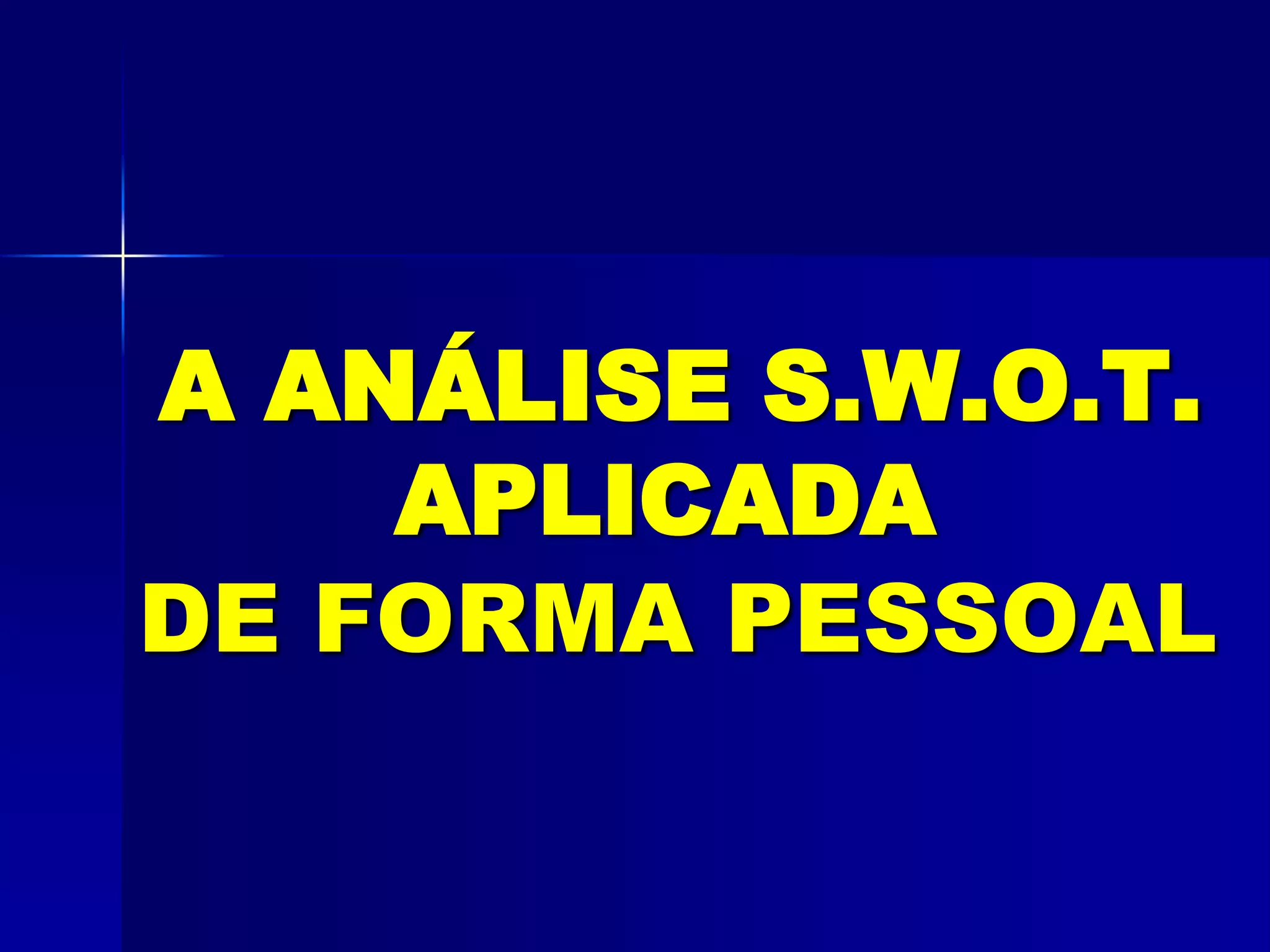 O documento discute a análise SWOT e como ela pode ser aplicada pessoalmente para avaliar pontos fortes, fracos, oportunidades e ameaças em termos de desenvolvimento profissional e conquista de vagas de emprego. Ele explica como substituir os termos da organização por termos pessoais e dá exemplos de como identificar diferentes fatores na análise SWOT pessoal.