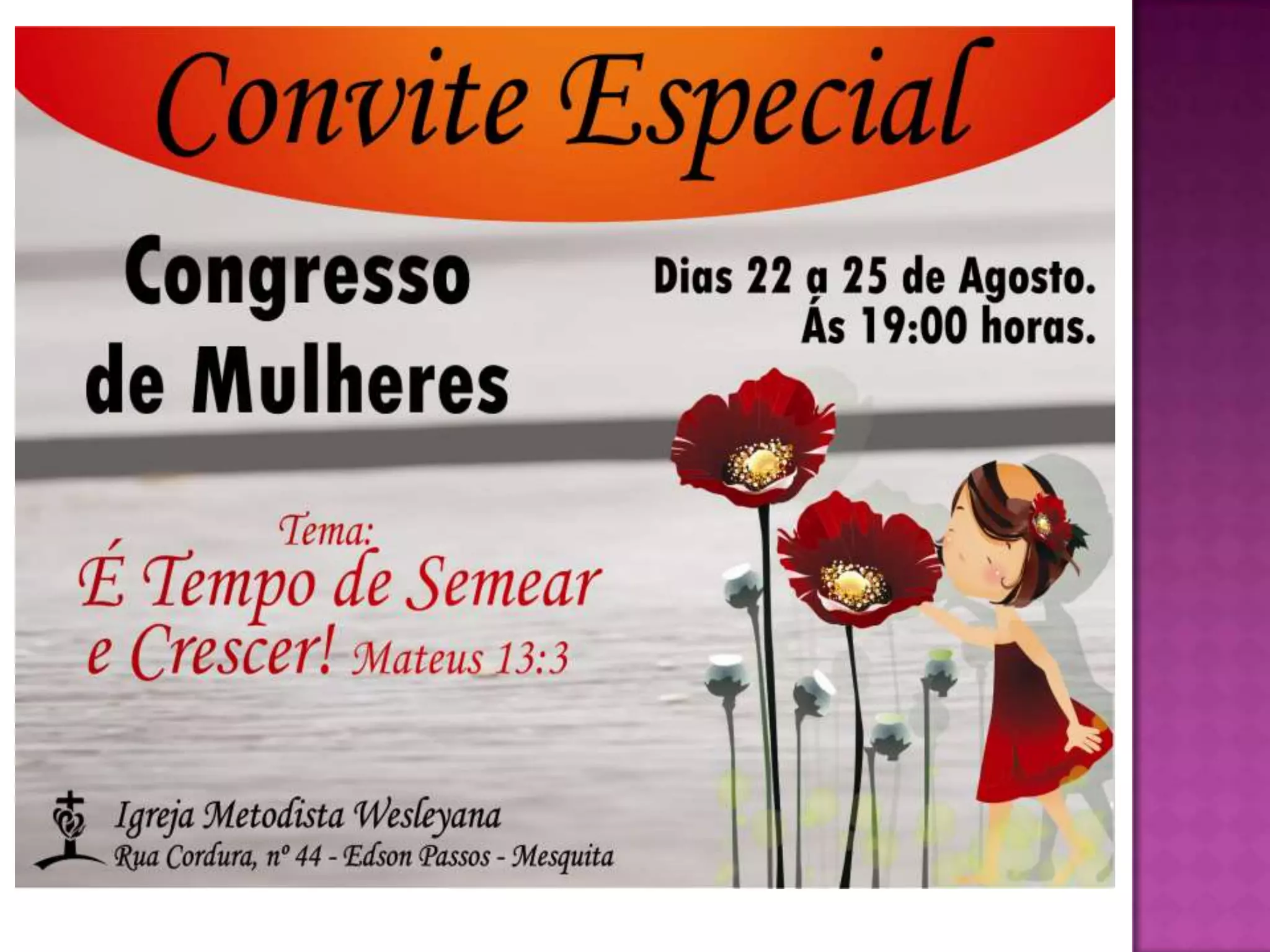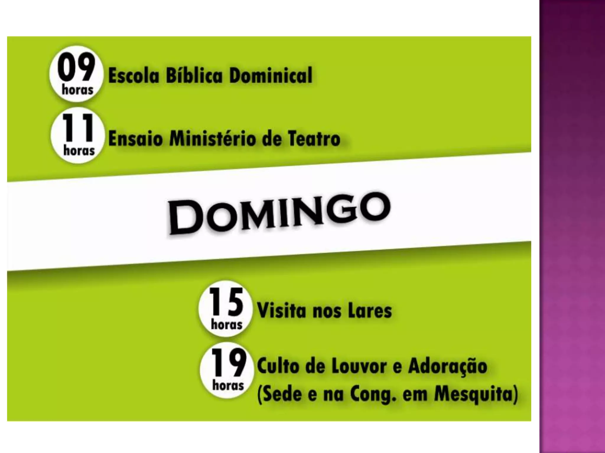O documento lista eventos e atividades de uma igreja durante agosto, incluindo um ensaio para o ministério de mulheres, evangelismo com a igreja inteira, um ensaio para o departamento de jovens, e um plano de oração pelas famílias da igreja.