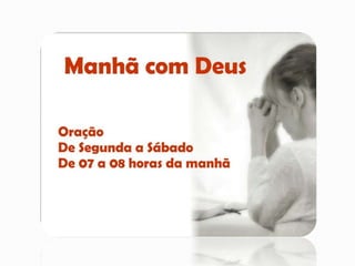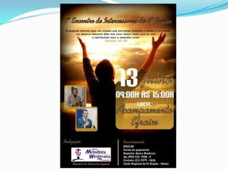 O documento lista os eventos e anúncios de uma igreja para as próximas semanas, incluindo estudos bíblicos às segundas-feiras, cultos de cura e libertação às terças-feiras, consagração de agradecimento às sextas-feiras, e cultos de adoração aos domingos. Também anuncia saídas para equipes de ação social e ministério de mulheres, ensaios, palestras, e o aniversário de 14 anos de outra congregação.