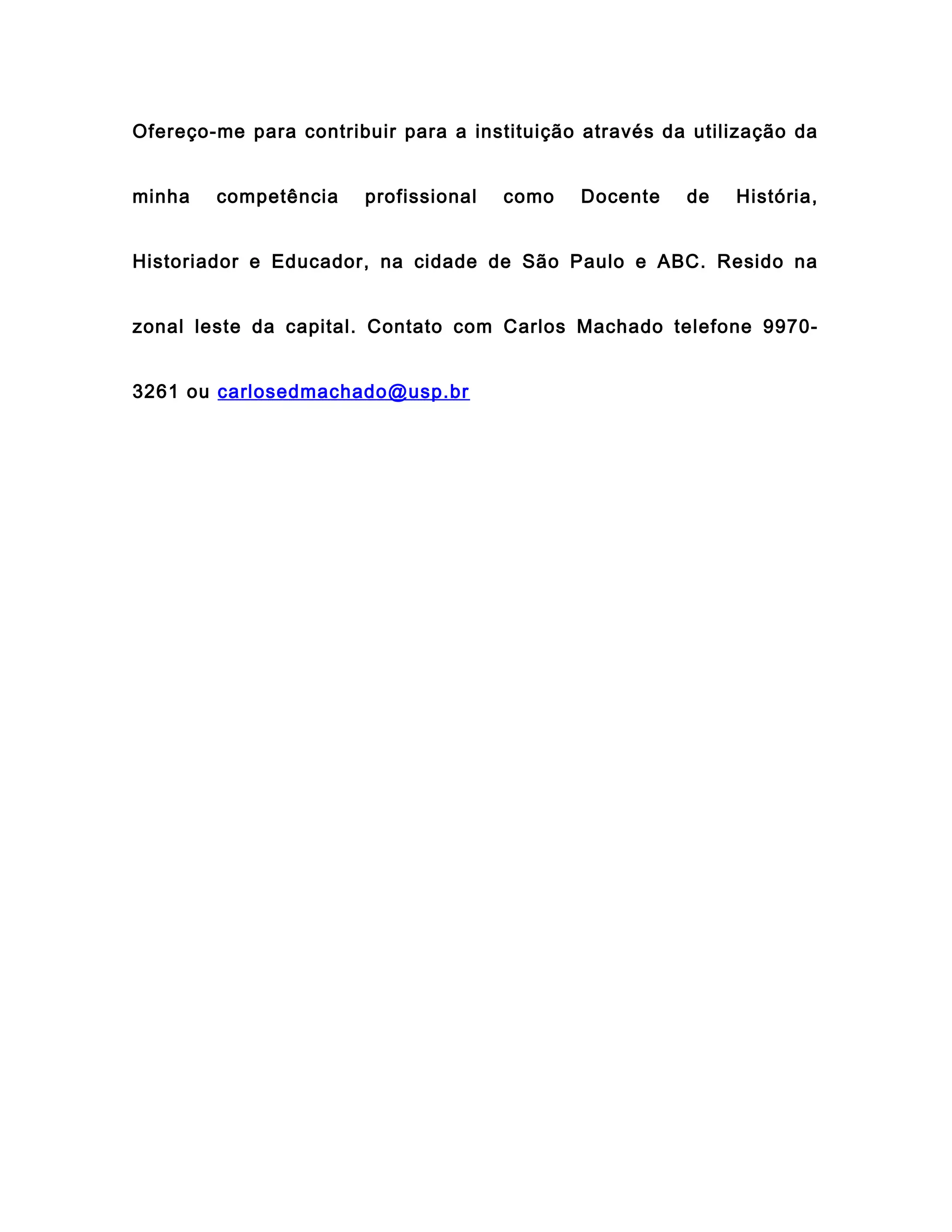 Um professor de história oferece seus serviços para contribuir com uma instituição usando sua experiência em ensino e pesquisa histórica na região de São Paulo. Ele mora na zona leste da cidade e fornece seus contatos por telefone e e-mail.