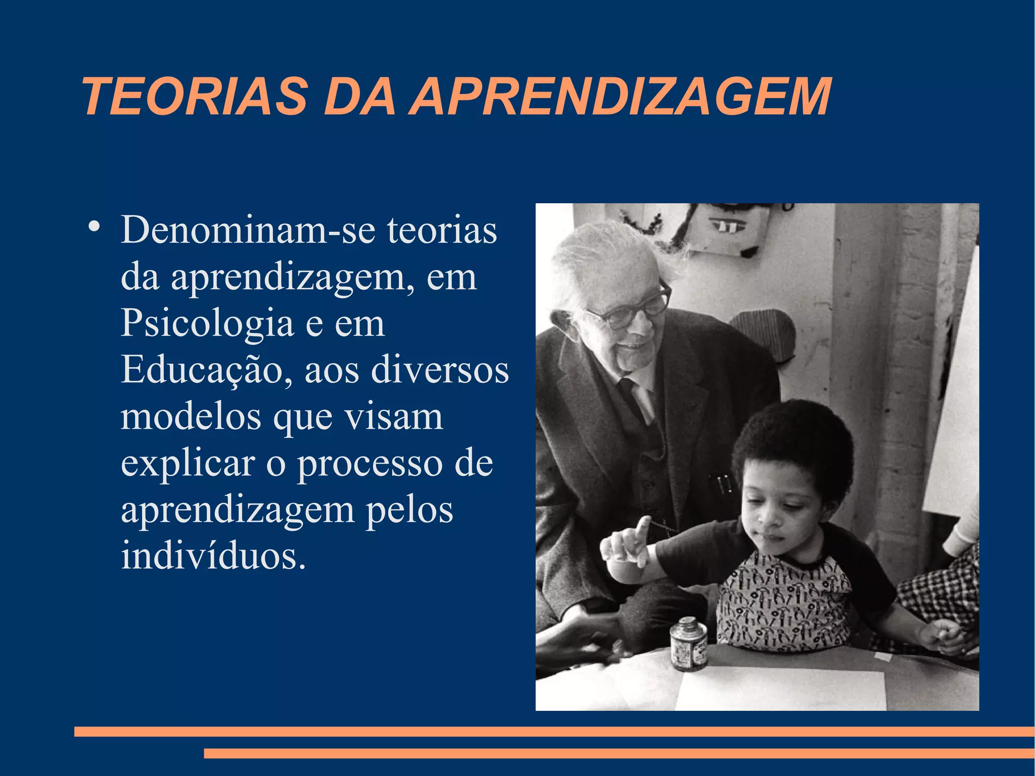 As teorias da aprendizagem buscam explicar como ocorre o processo de aprendizagem dos indivíduos. As principais abordagens são a comportamentalista, que se concentra no comportamento observável desconsiderando aspectos mentais; a cognitivista, que analisa os processos internos; e a humanista. A teoria comportamentalista de Skinner foca apenas no comportamento observável ao analisar a aprendizagem.