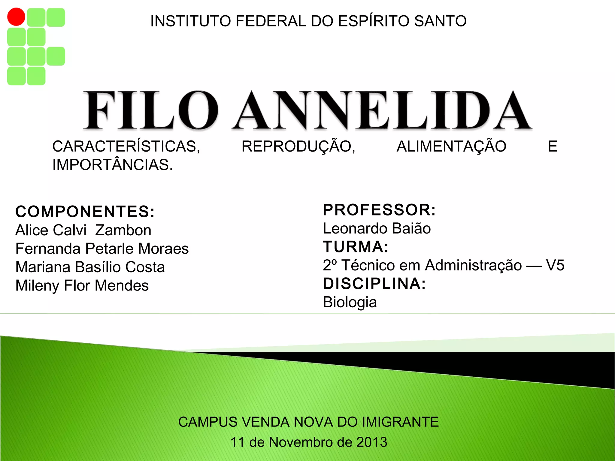 Este documento descreve as características, importância e componentes dos anelídeos, incluindo minhocas, poliquetos e sanguessugas. Ele discute a anatomia, reprodução, alimentação e importância ecológica e médica destes animais.