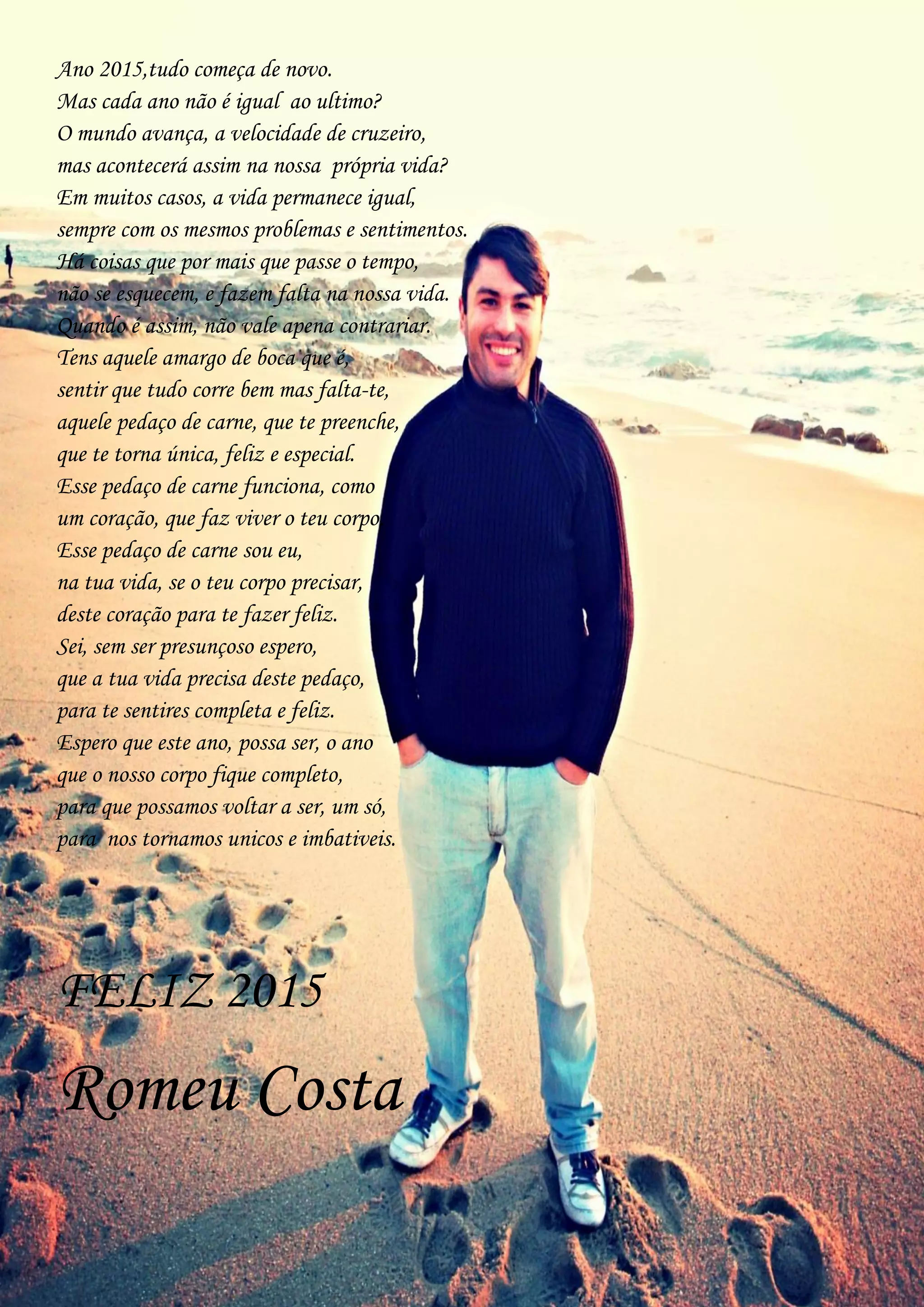 O autor reflete sobre como cada ano traz novas oportunidades, mas também desafios em manter as coisas que nos fazem felizes. Ele oferece seu coração para completar a vida de alguém, trazendo felicidade no novo ano.