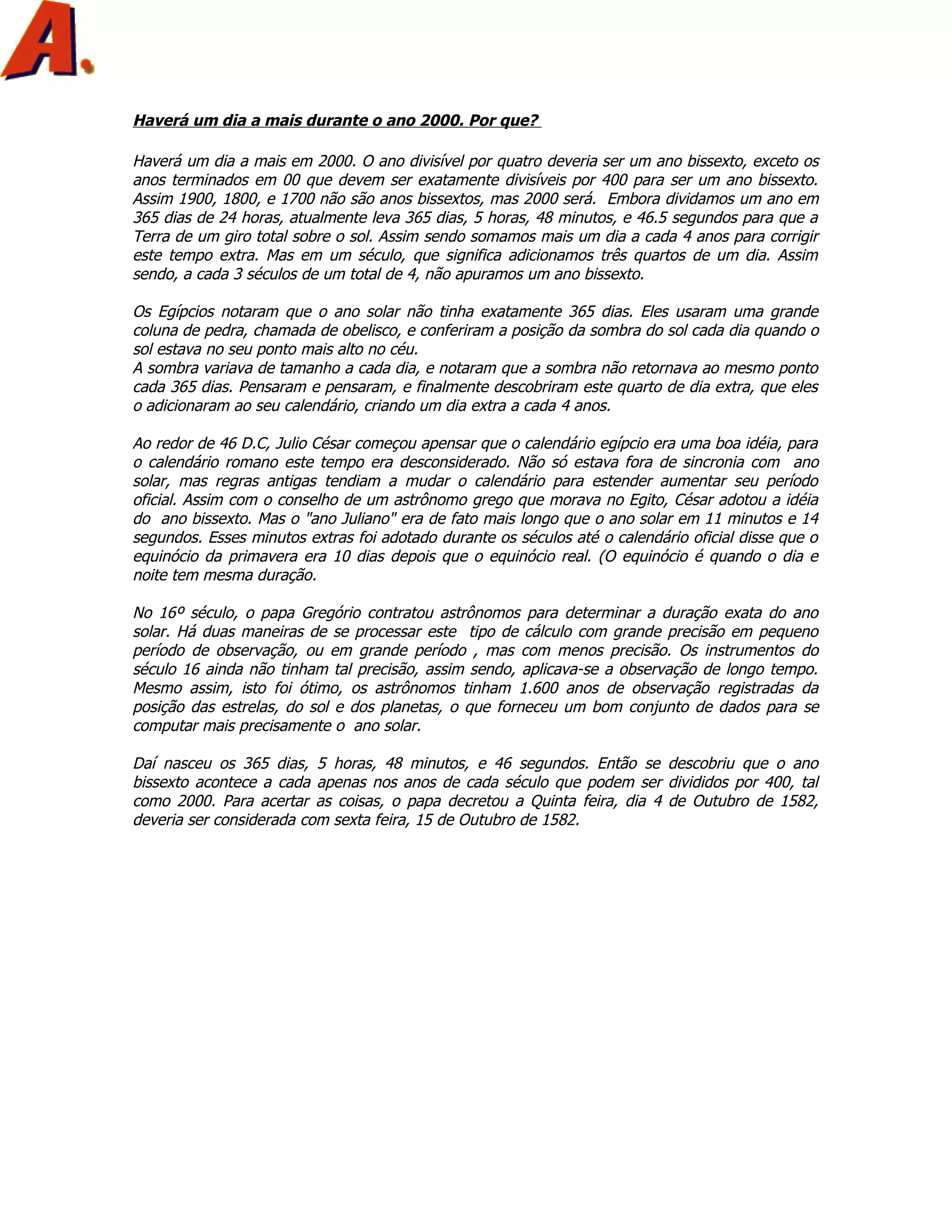 3) No século 16, astrônomos determinaram que a duração exata do ano solar é de 365 dias, 5 horas, 48 minutos e 46 segundos e que apenas anos séculos divisíveis por 400, como 2000, seriam b
