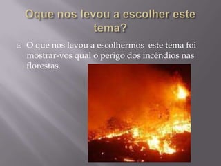 O documento discute os perigos dos incêndios florestais, incluindo como prevenir incêndios e o perigo da extinção das florestas para a vida selvagem. Ele também lista algumas espécies de árvores em risco de extinção e meios de apresentação como Word, PowerPoint e panfletos.
