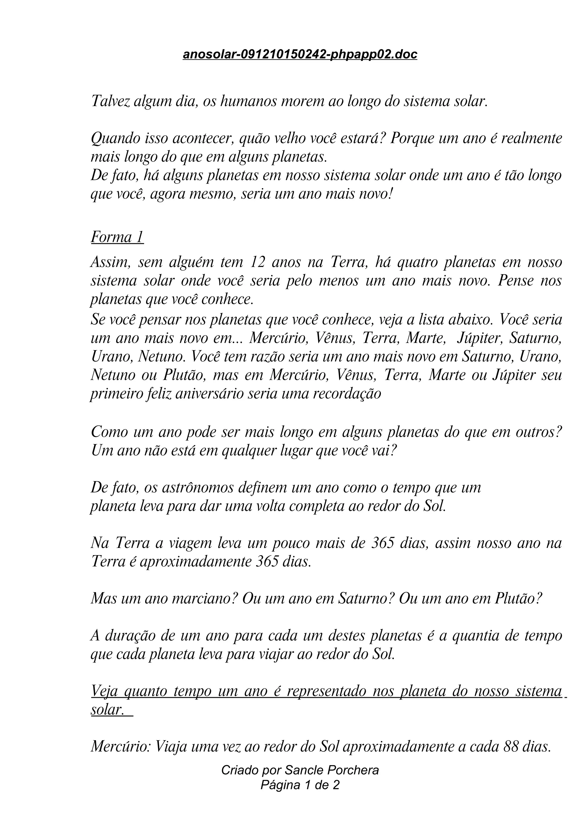 O documento explica que um ano em outros planetas pode ser mais longo do que na Terra, dependendo do tempo que cada planeta leva para orbitar o Sol, variando de 88 dias em Mercúrio a 249 anos em Plutão.