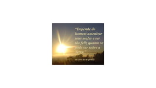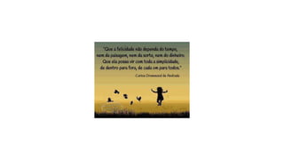O documento discute o que é verdadeira felicidade. Aponta que a felicidade não está em posses materiais, em um grande amor ou em ilusões, mas sim em valorizar as pequenas coisas como família, amigos e o presente momento. A felicidade verdadeira vem de dentro e de viver cada dia com alegria e propósito.