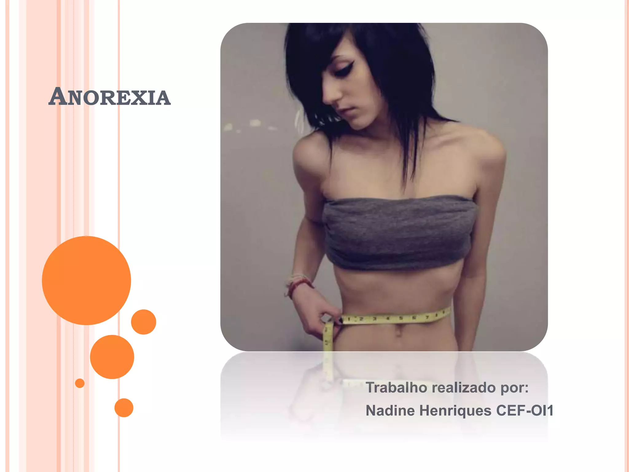 O documento discute a anorexia, definindo-a como um transtorno alimentar psicológico caracterizado por manter o peso abaixo dos níveis normais e se ver como "gordo". Ele lista sinais como contagem de calorias, pular refeições e usar roupas largas, e diz que o tratamento envolve terapia individual, em grupo e familiar ou hospitalar em casos graves.