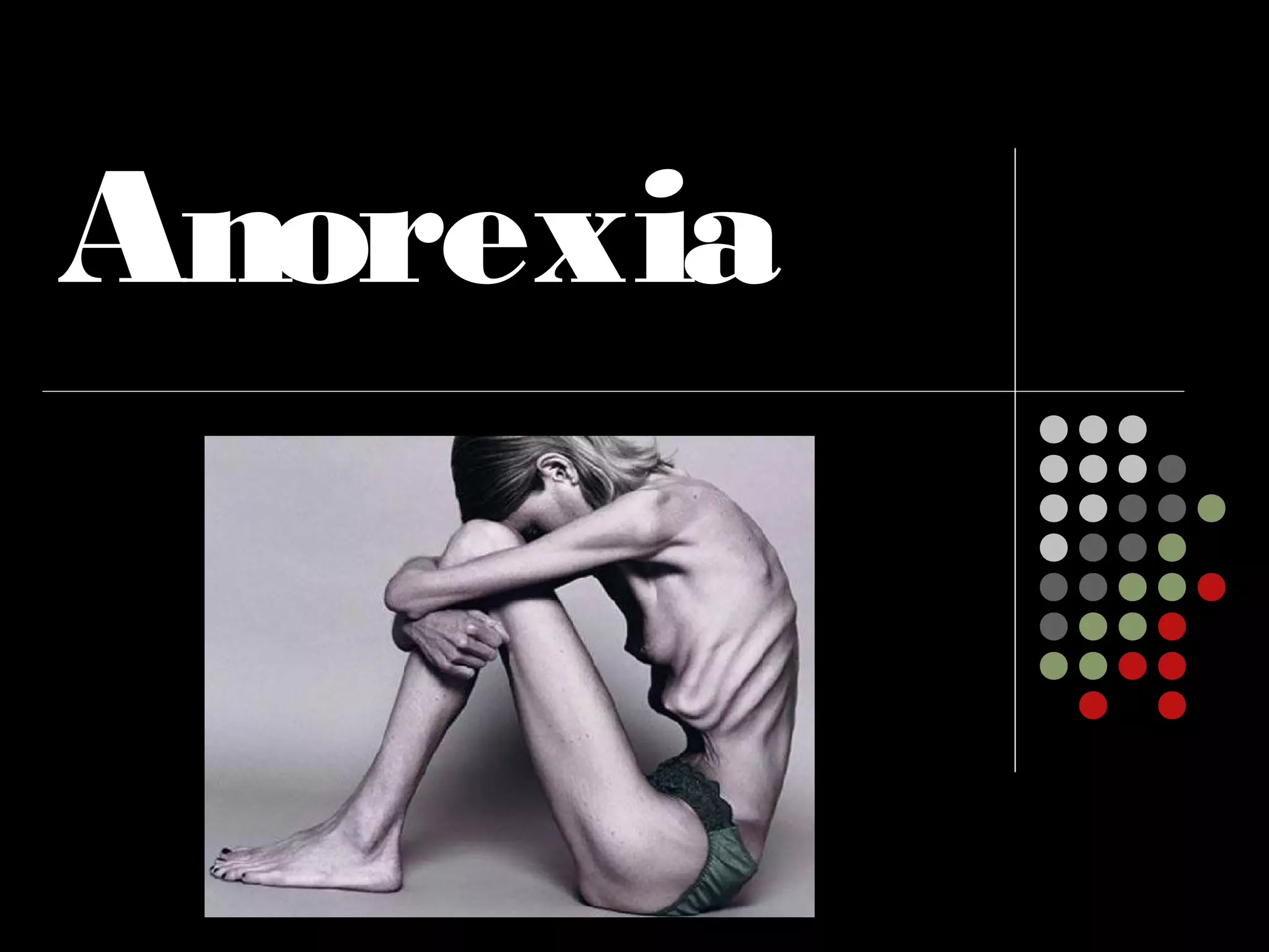 O documento discute a anorexia nervosa, definindo-a como um distúrbio alimentar caracterizado por dieta insuficiente e rígida. Apresenta os sintomas, causas, consequências e formas de tratamento, incluindo terapias psicológicas e hospitalização em casos graves. Também dá exemplos de famosas que sofreram com a doença, como a modelo brasileira Ana Carolina Reston, cuja morte aos 21 anos serviu de alerta sobre a seriedade da anorexia.