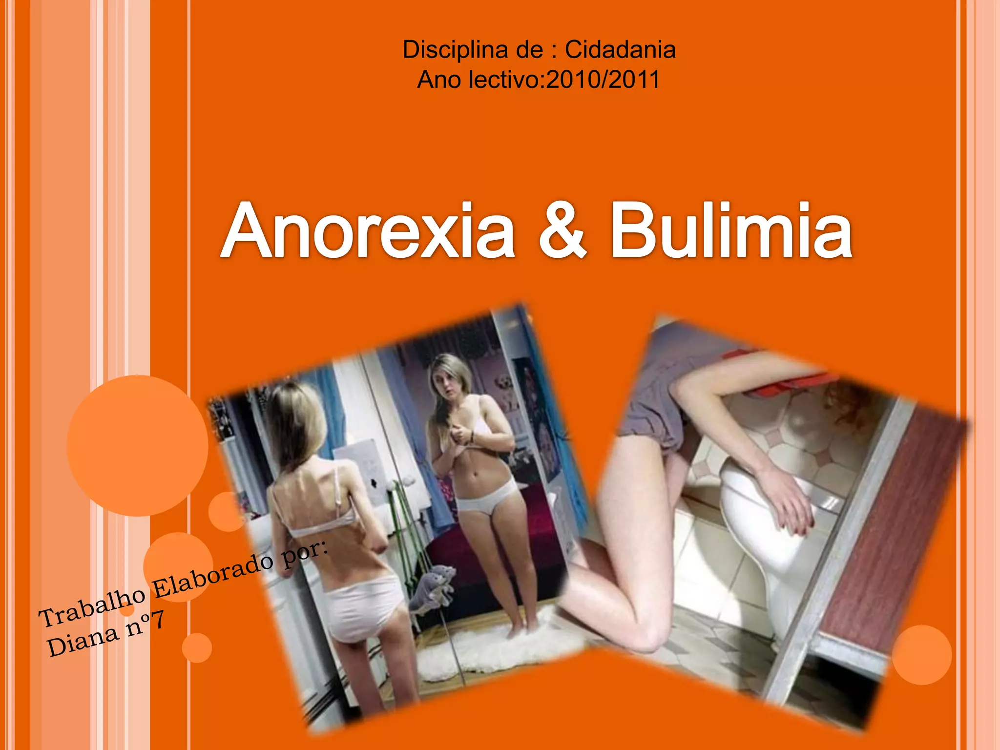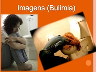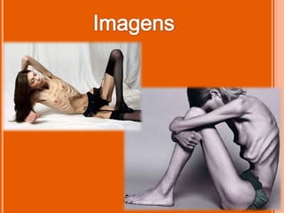 Este documento discute os transtornos alimentares anorexia nervosa e bulimia nervosa. Ele fornece detalhes sobre os sintomas de cada um, incluindo a perda de peso, problemas menstruais e outros efeitos físicos da anorexia. Também discute as taxas de mortalidade associadas e os desafios no tratamento da anorexia. Para a bulimia, destaca os episódios de compulsão alimentar seguidos de vômito e os riscos para a saúde associados, além das opções de tratamento com a