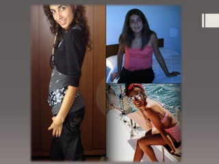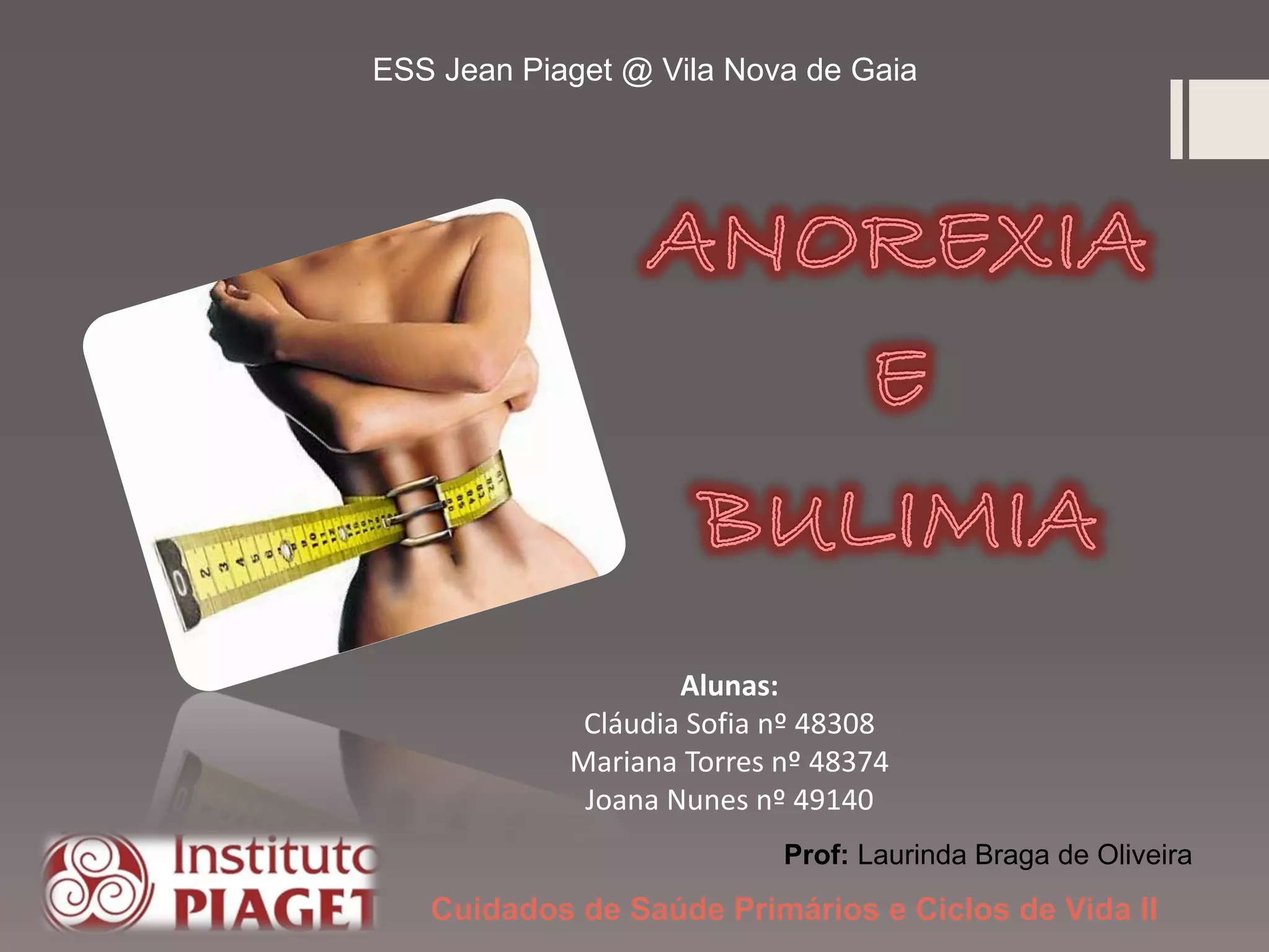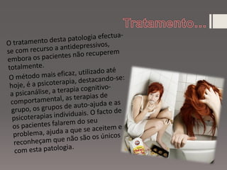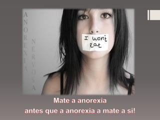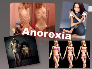 O documento discute anorexia nervosa, um transtorno alimentar caracterizado por obsessão com a magreza e rejeição de alimentos, levando à perda de peso drástica. Detalha os sintomas, causas, complicações de saúde e tratamento focado em recuperar o peso corporal normal por meio de terapia.