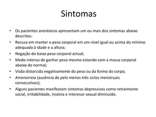 A anorexia é caracterizada por uma percepção distorcida do próprio corpo, levando a pessoa a se ver como gorda mesmo após perda de peso excessiva. Os sintomas incluem recusa em manter peso saudável, negação da magreza, medo de engordar e visão negativa do próprio corpo. Se não tratada, pode levar a complicações de saúde graves e até morte. O tratamento envolve terapia, medicamentos e, em casos graves, internação para reposição nutricional.