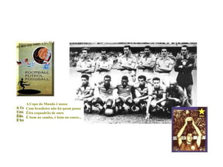 A Copa doMundo é nossaCom brasileiro não há quem possaÊêta esquadrão de ouroÉ bom no samba, é bom no couro...