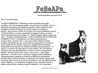 Festival de Besteirasque Assola o PaísTire a Vaca do ElevadorEm BELO HORIZONTE, ultimamente, têm acontecido coisas muito estranhas. Ora é um movimento político, ora uma festa de caridade, ora um projeto-de-lei proposto pelos deputados mineiros. enfim, acontecem coisas estranhas. às quais a Pretapress dá o devido registro, na medida do possível. Agora mesmo a leitora Vera Gomes envia recorte publicado no jornal "Estado de Minas", no qual o comandante da Limpeza Urbana, ou seja, o Diretor do Departamento de Limpeza, Sr. Teófilo Ezequiel Adjuto Campos, faz saber , "Prefeitura de Belo Horizonte - AVISO AOS DONOS DE ANIMAIS EM BAIRROS E VILAS - Cientificamos aos senhores proprietários de cavalos, cabras, carneiros, bois e vacas, cuja criação é feita de maneira irregular, soltos pelas ruas, que sua retirada ou segregação deve ser feita no prazo máximo de dez (10) dias, sendo que a qualquer titulo é proibida a manutenção desses espécimes de animais em edifícios de apartamentos". E segue-se a assinatura do zeloso diretor acima referido. Isto, caros leitores uagaenses. prova que Belo Horizonte vai entrar nos eixos, em questão de animais. Não pode mais ter boi, cavalo e vaca na rua e - o que é mais importante - a ressalva é clara ; sendo que a qualquer titulo é proibida a manutenção desses espécimes de animais em edifícios de apartamentos portanto, leitores belo-horizontinos, se algum de vocês mantém algum cavalo (ou mesmo égua) na área de serviço do seu prédio, se você tem algum boi sendo criado - digamos - no seu banheiro, ou alguma vaca no elevador, trate de se desfazer desses bichos. ainda que sejam de estimação. A lei é para todos.Stanislaw Ponte Preta