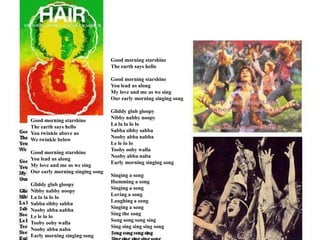 Good morning starshineTheearth says helloGood morning starshineYou lead us alongMy love and me as we singOur early morning singing songGliddy glub gloopyNibby nabby noopyLa la la lo loSabba sibby sabbaNooby abba nabbaLe le lo loTooby ooby wallaNooby abba nabaEarly morning singing songSinging a songHumming a songSinging a songLoving a songLaughing a songSinging a songSing the songSong song song singSing sing sing sing songGood morning starshineThe earth says helloYou twinkle above usWe twinkle belowGood morning starshineYou lead us alongMy love and me as we singOur early morning singing songGliddy glub gloopyNibby nabby noopyLa la la lo loSabba sibby sabbaNooby abba nabbaLe le lo loTooby ooby wallaNooby abba nabaEarly morning singing song