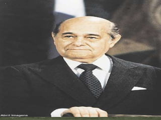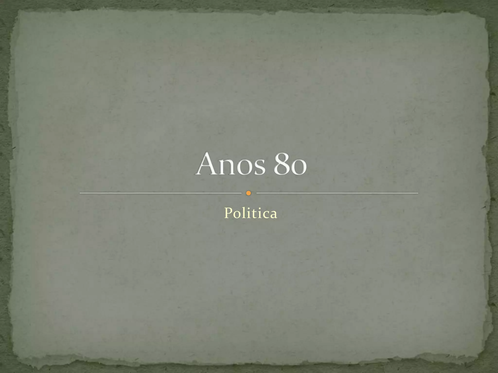 O documento descreve a transição do Brasil da ditadura militar para a democracia na década de 1980. Apresenta o movimento "Diretas Já" que pedia eleições diretas e a eleição indireta de Tancredo Neves como primeiro presidente civil, porém ele faleceu antes de assumir. Também discute o período como a "Década Perdida" devido à crise econômica e baixo crescimento do PIB.