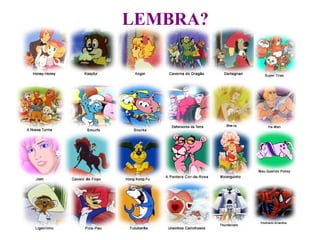 O documento lista várias recordações nostálgicas de brincadeiras, músicas, programas de TV, modismos e objetos populares das décadas de 1970, 1980 e 1990, como datilografia, provas mimeografadas, Barão Vermelho, canetas de 10 cores, Michael Jackson, jogos como queimada e amarelinha, balas e pirulitos, Pequeno Pônei, Vaga-Lume, walkmans, biquinis asa delta e mais, convidando o leitor a relembrar e compartilhar essas memórias com amigos