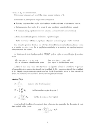 1) O capítulo descreve a análise de variância (ANOVA), que compara mais de dois grupos em termos de localização média. ANOVA testa se as médias dos grupos são significativamente diferentes.