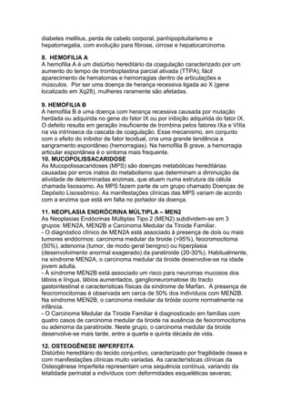 O documento lista 19 doenças genéticas raras abrangidas pelas novas diretrizes de testes genéticos. As doenças incluem vários tipos de câncer hereditário, distúrbios metabólicos, síndromes neurológicas e musculares, e outras condições genéticas raras que podem causar problemas de saúde graves. Para cada doença é fornecida uma breve descrição dos sintomas e características.