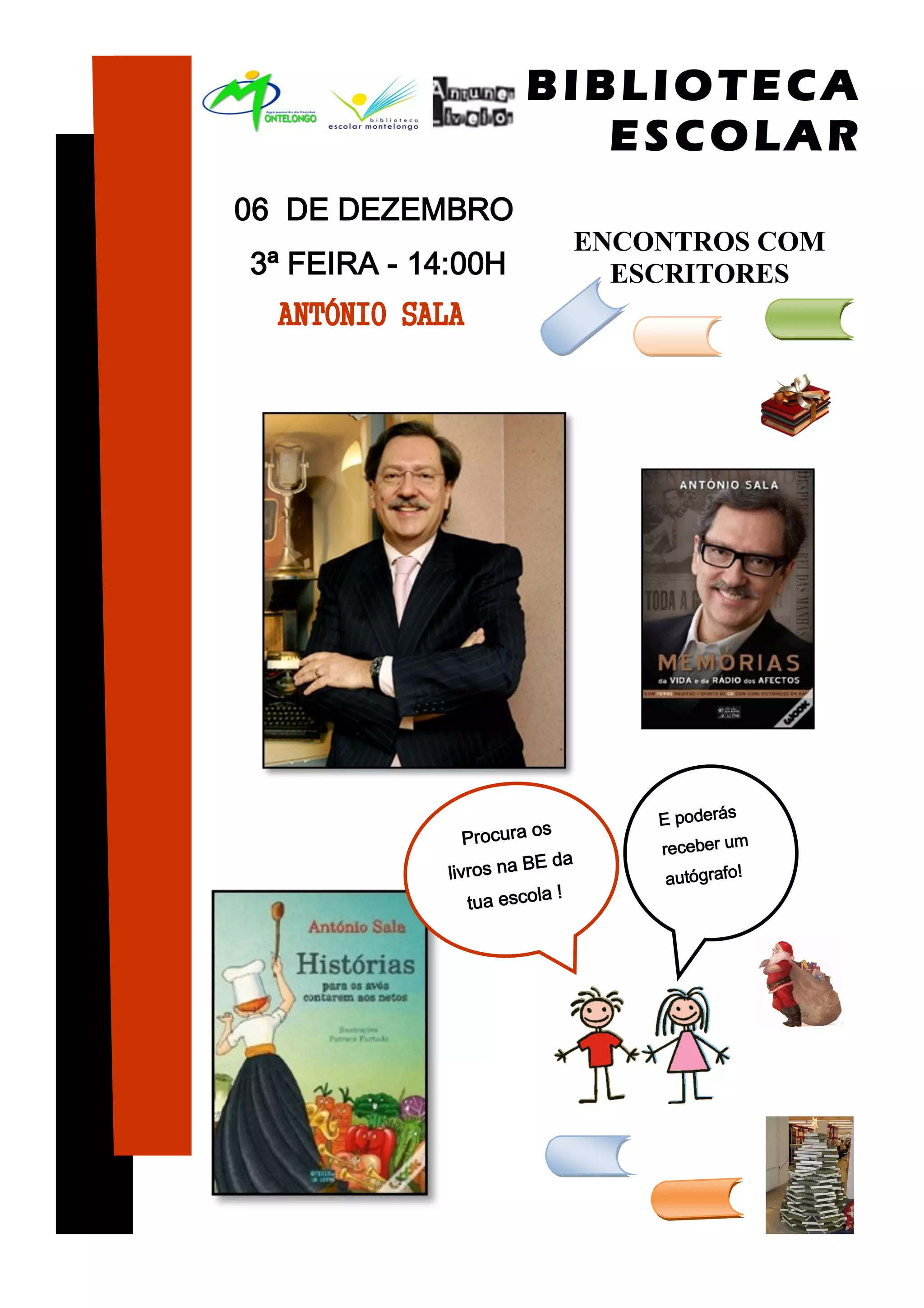 A biblioteca escolar anuncia um encontro com o escritor António Sala na terça-feira às 14h. Os alunos poderão procurar livros na biblioteca e receber um autógrafo do escritor.