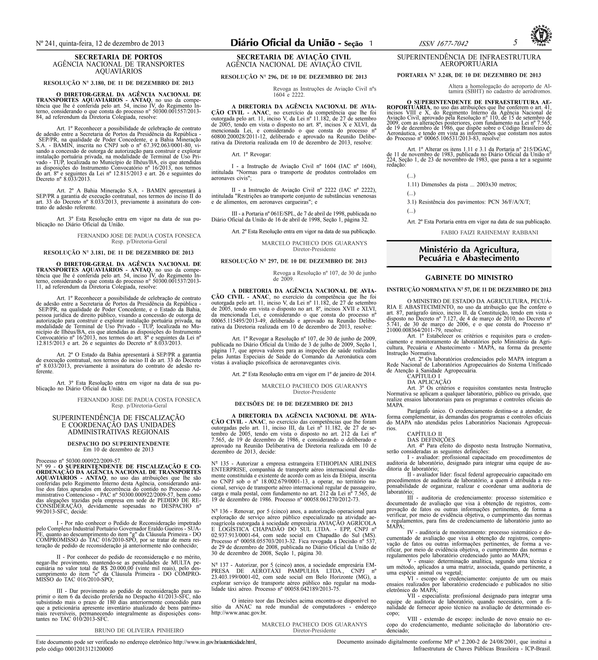 Este documento contém várias resoluções e portarias emitidas por agências governamentais brasileiras em 10 e 11 de dezembro de 2013. As resoluções reconhecem a possibilidade de celebração de contratos de concessão portuária, alteram informações sobre aeroportos, revogam instruções anteriores e autorizam companhias aéreas a operar no Brasil. As portarias alteram informações técnicas sobre um aeroporto e decidem sobre penalidades a uma empresa portuária.