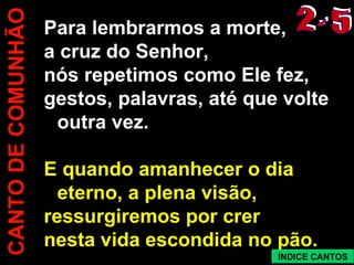 O documento contém cinco estrofes de um canto sobre a comunhão cristã. Cada estrofe descreve um aspecto da ceia do Senhor: 1) Jesus instituiu a ceia antes de sua morte e ressurreição; 2) a ceia lembra a morte de Cristo na cruz; 3) a ceia alimenta o amor fraterno e prepara para a glória celestial; 4) o pão é a vida viva dada por Deus Pai para que não morramos; 5) Cristo ressuscitou e anunciará esta verdade a toda a