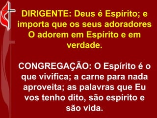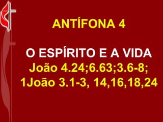 Este antífona discute a importância do Espírito Santo e do nascimento espiritual. Ele afirma que Deus é Espírito e deve ser adorado em Espírito e verdade, que o Espírito é que dá vida e que é necessário nascer de novo do Espírito. Também discute que os que nascem do Espírito são como o vento, invisíveis, e que os cristãos são chamados de filhos de Deus.