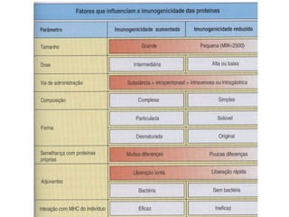 O documento define antígeno como qualquer material que pode ser reconhecido pelo sistema imunológico de um organismo. Todo imunógeno é um antígeno, mas nem todo antígeno é um imunógeno, pois nem todo antígeno é capaz de estimular uma resposta imune. Para ser considerado imunogênico, um antígeno precisa ser estranho, ter alto peso molecular, ter complexidade química e ter capacidade de ser degradado.