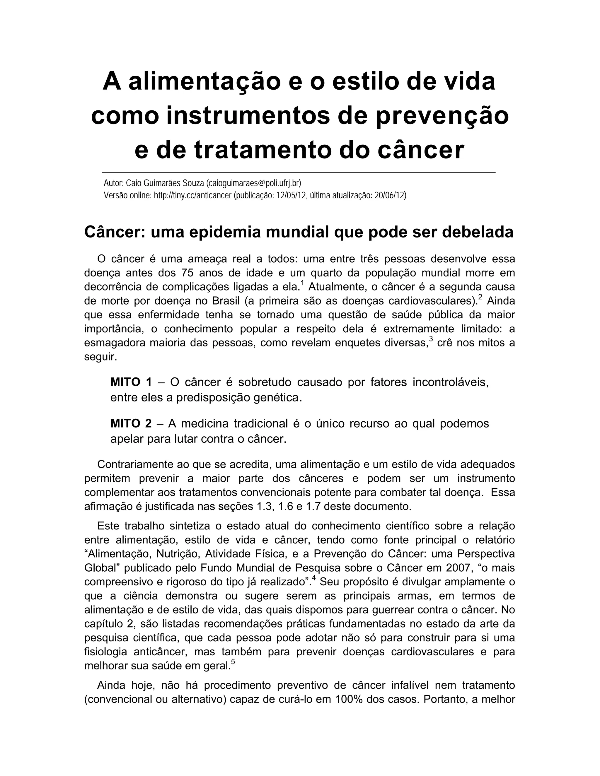 O documento discute a relação entre alimentação, estilo de vida e câncer. Aponta que a maioria dos cânceres são causados por fatores ambientais como dieta e nível de atividade física, não por fatores genéticos. Defende que uma alimentação saudável e estilo de vida ativo podem prevenir a maioria dos cânceres e auxiliar no tratamento, mas essas estratégias ainda não fazem parte dos protocolos médicos convencionais.