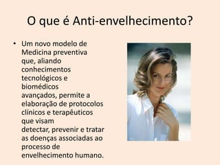 O documento discute os processos de envelhecimento humano e terapias em desenvolvimento para retardá-lo, incluindo células-tronco, reparo de DNA, dopagem genética e nanomedicina. Também aborda as principais pausas hormonais que ocorrem com a idade, como andropausa, menopausa e tireopausa, e como a modulação hormonal bioidêntica pode otimizar os níveis hormonais e melhorar a qualidade de vida.