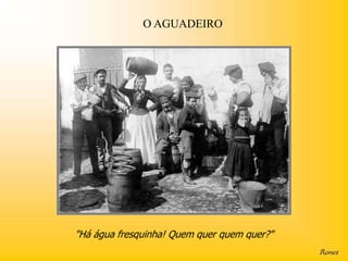 O documento apresenta descrições de várias profissões tradicionais de Lisboa, como o aguadeiro, alfarrábista, trapeiro, barbeiro, criada de servir, fotógrafo, moço de fretes, limpa-chaminés, modista, padeiro, pescador, propagandista, sapateiro, vendedora de galinhas, vendedor de castanhas, vendedor de gelados, vendedora de rendas, vendedora de figos, vendedora de petiscos, lavadeira, polícia, vendedora