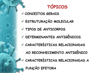 O documento aborda os conceitos gerais sobre antígenos e anticorpos, explicando sua estrutura molecular e os diferentes tipos de anticorpos, como IgA, IgD, IgE, IgG, e IgM. Ele descreve a função das imunoglobulinas no sistema imunológico, como o reconhecimento antigênico e suas funções efetoras, além de detalhar os determinantes antigênicos e fatores importantes para o reconhecimento. O texto fornece uma visão abrangente do sistema imune humoral e das complexidades relacionadas aos anticorpos.