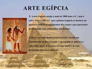 A arte egípcia surgiu há mais de 3.000 anos e floresceu entre 1560-1309 a.C., buscando refletir movimentos corporais e delicadeza de formas. Os egípcios usavam suas artes para registrar histórias de faraós, deuses e pessoas, representando status através do tamanho nas obras. Arquitetura notável inclui pirâmides construídas como tumbas reais a partir de 3.200 a.C.