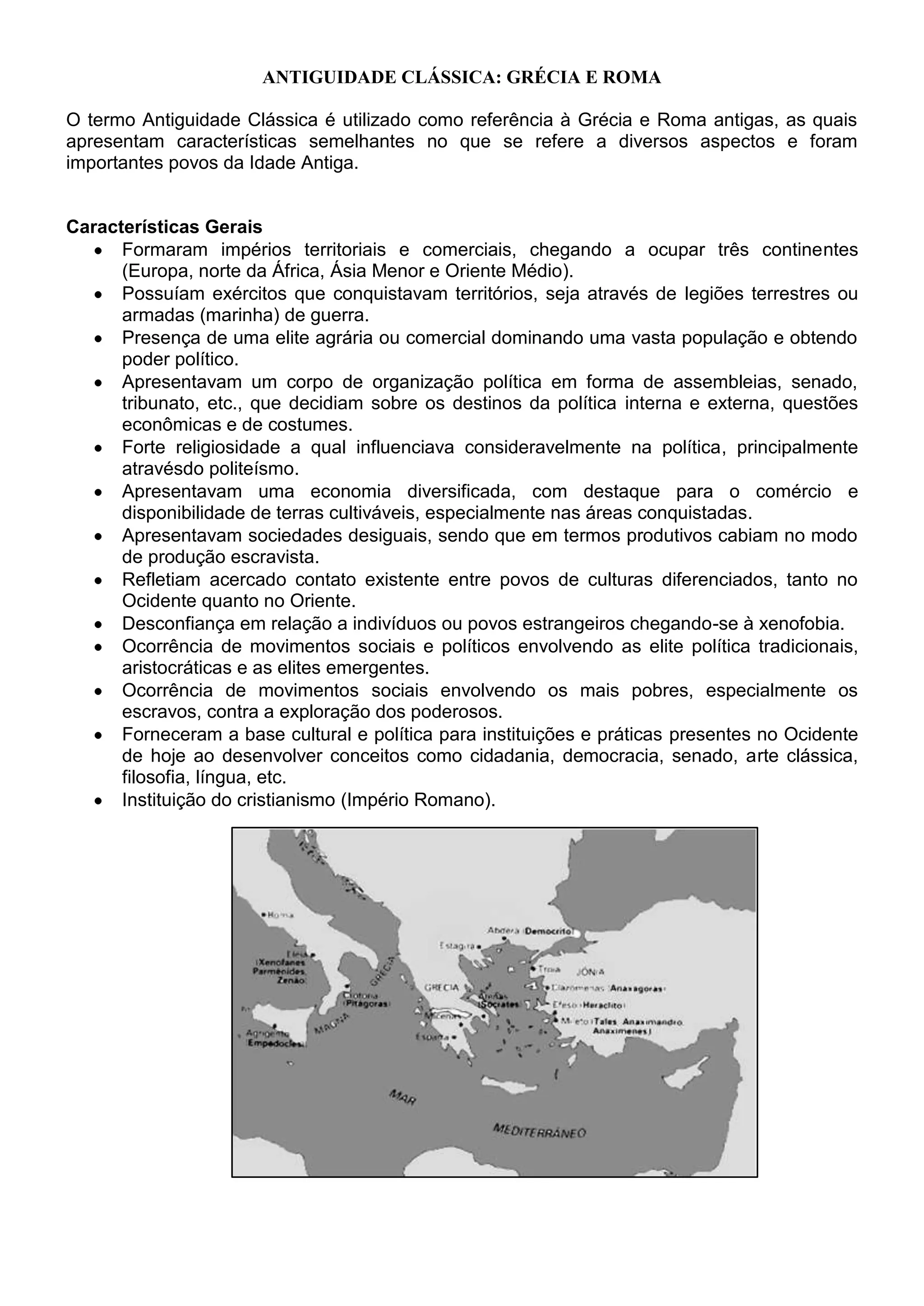 A Grécia e Roma antigas apresentavam características semelhantes como impérios territoriais e comerciais, exércitos para conquista de territórios, e sociedades desiguais dominadas por elites agrárias ou comerciais. Ambas influenciaram consideravelmente a cultura ocidental moderna.