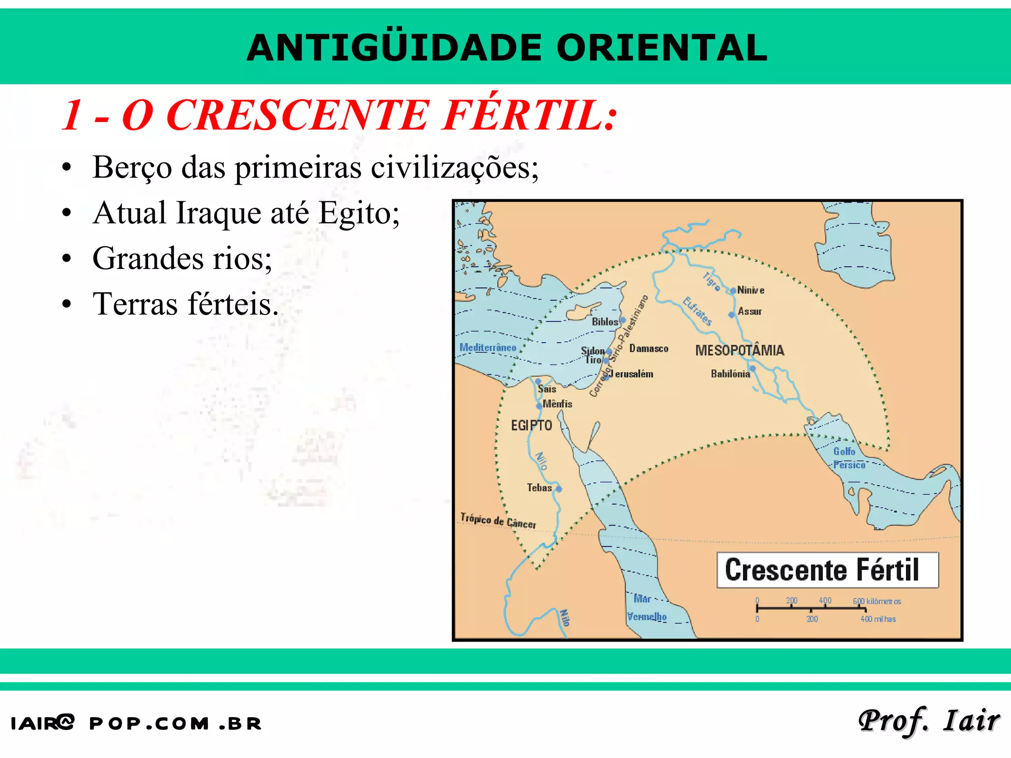 1) O documento descreve as primeiras civilizações que surgiram no Crescente Fértil, notadamente no Egito e Mesopotâmia, com ênfase nas características de seus impérios teocráticos e modo de produção asiático.