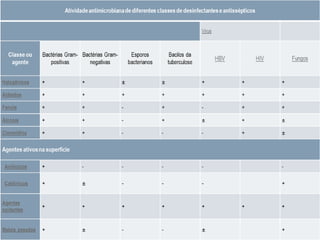 O documento discute conceitos gerais sobre antissépticos, seu uso, assepia, efeitos adversos, programas de controle de infecção, características desejáveis em antissépticos e classes de agentes antissépticos. É descrito que antissépticos são substâncias usadas externamente para limitar infecções e que variam de acordo com sua ação, toxicidade e outros fatores. Diferentes classes como álcool, compostos iodados e clorexidina são exemplos descritos.