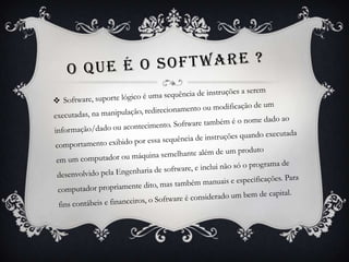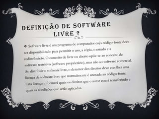 O documento discute o software proprietário, que é licenciado exclusivamente para o produtor e tem restrições na redistribuição e modificação. Também fala sobre software comercial, que é desenvolvido para fins empresariais, e sobre cuidados ao baixar software da internet, como verificar se programas P2P permitem compartilhamento ilegal.