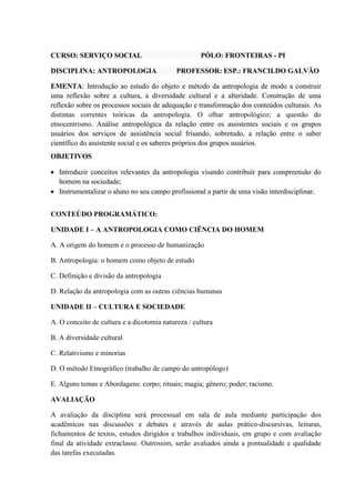Este documento descreve uma disciplina de Antropologia para estudantes de Serviço Social. A disciplina introduz conceitos antropológicos para ajudar os alunos a compreender as pessoas e culturas. O curso aborda tópicos como a origem humana, definição de cultura, diversidade cultural e métodos antropológicos. A avaliação inclui participação em debates, leituras, trabalhos individuais e em grupo.