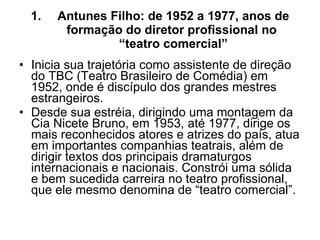 O documento aborda a trajetória de Antunes Filho no teatro brasileiro, desde sua formação no teatro comercial até a criação do espetáculo 'Macunaíma', que se tornou um marco do teatro de pesquisa. Antunes Filho desenvolve um método pedagógico inovador voltado para a formação de atores, enfatizando a importância da pesquisa estética e da colaboração na criação teatral. Ao longo de sua carreira, ele dirige diversas obras que exploram mitos e arquétipos da sociedade brasileira, contribuindo significativamente para o desenvolvimento do teatro no Brasil.