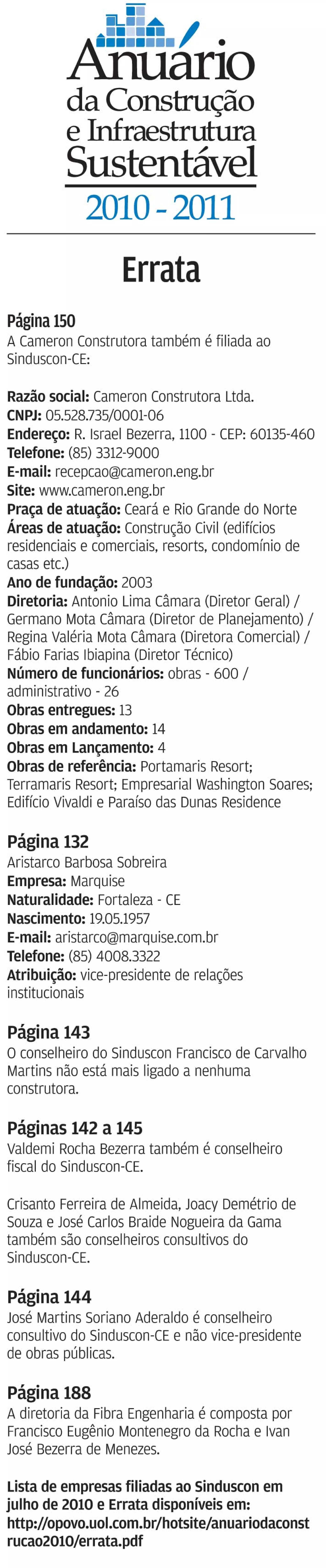 O documento lista informações sobre empresas associadas ao Sindicato da Indústria da Construção Civil do Ceará (Sinduscon-CE), incluindo seus códigos, dados cadastrais e representantes. São fornecidos detalhes como razão social, endereço, telefone e nome dos representantes de várias construtoras, incorporadoras e empresas de engenharia do Ceará.