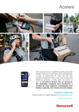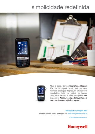O documento promove o Scanphone Dolphin 60s da Honeywell, um dispositivo móvel que combina as funcionalidades de smartphone, leitor de código de barras, GPS e rádio de voz para aumentar a produtividade dos usuários ao realizar várias tarefas em um único aparelho compacto.
