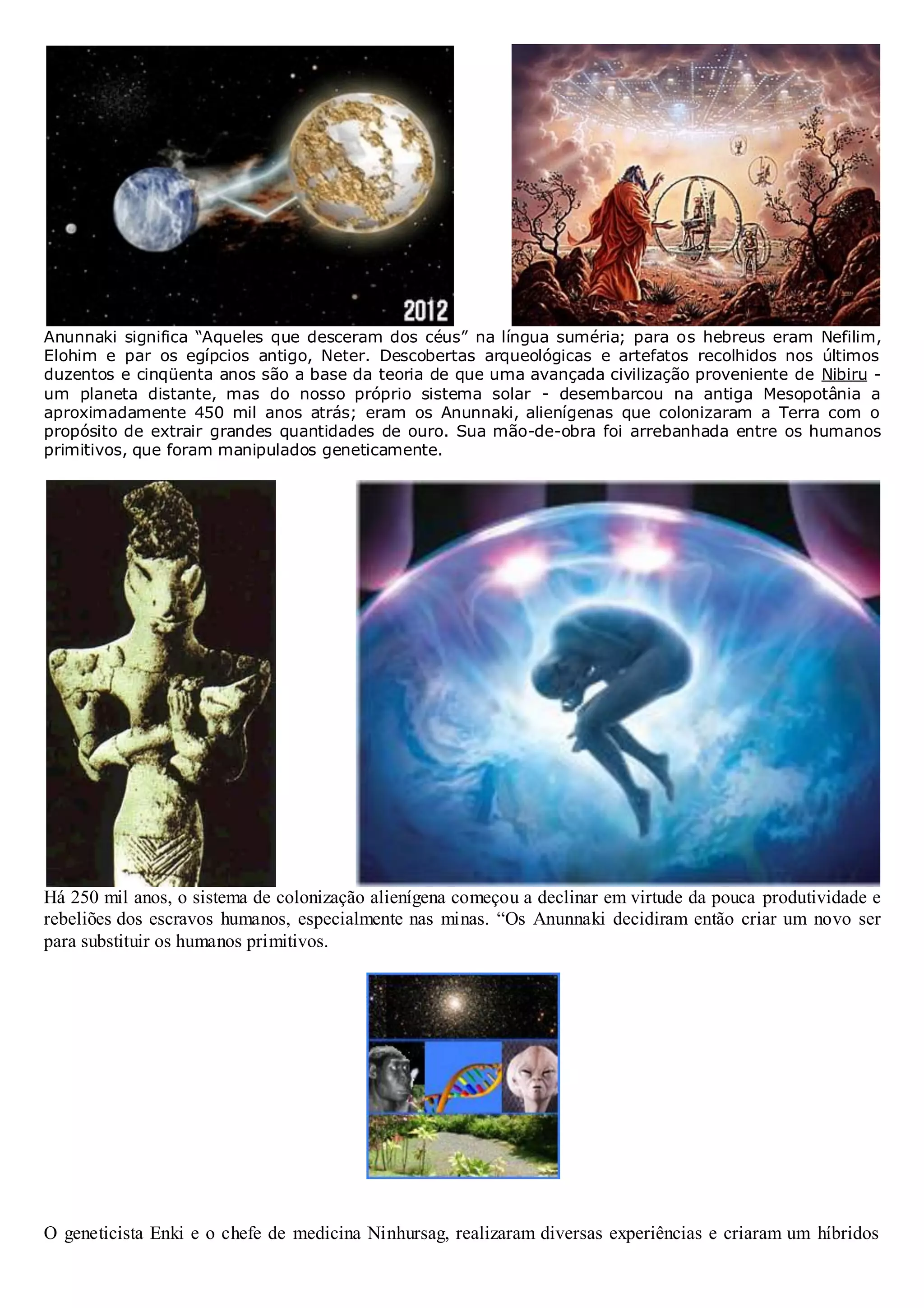 1) Os Anunnaki eram alienígenas que colonizaram a Terra há 450 mil anos para extrair ouro, usando humanos primitivos como escravos. 2) Há 250 mil anos, os Anunnaki criaram os humanos modernos através de engenharia genética para substituir os escravos primitivos. 3) Evidências arqueológicas, astronômicas, tecnológicas e documentais sugerem que os Anunnaki existiram e influenciaram a evolução humana.